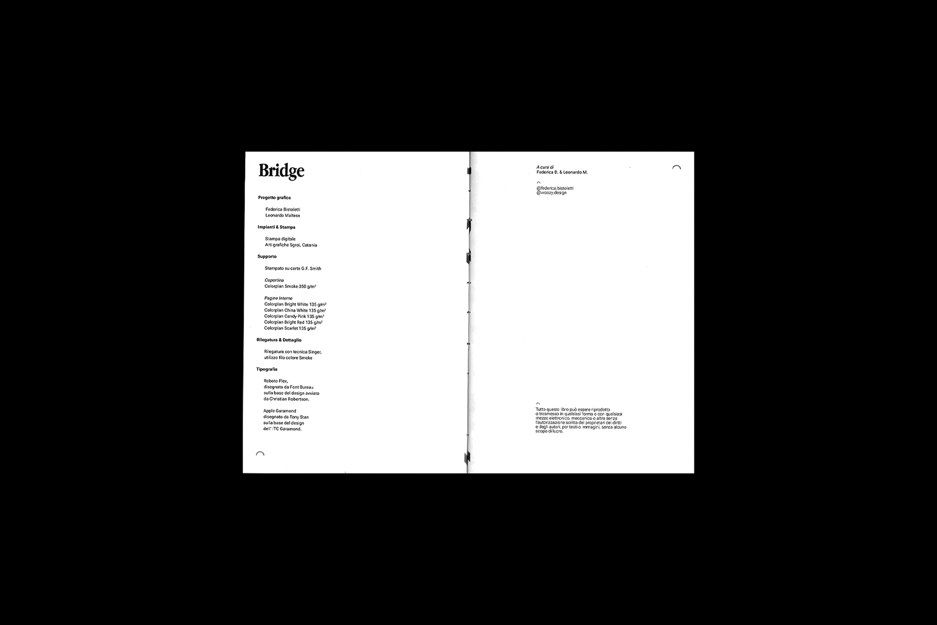 Bridge è un artefatto editoriale che esplora il collegamento fra la realtà di Catania e quella di Seattle. Un ponte tra nuove e vecchie vibrazioni e disillusioni derivate dagli anni ’90, nube di fumo e soprattutto di trasformazione. Due culture apparentemente diverse, ma che in realtà possono trovare un punto di incontro in una dimensione temporale che ha segnato le menti di tutti, tra adrenalina, risentimento, incertezza ma soprattutto un ponte la cui materia prima è la musica, legame assoluto fra questi due universi. Bridge is an editorial artifact that explores the connection between the realities of Catania and Seattle. A bridge between new and old vibrations and disillusions derived from the 1990s, cloud of smoke and above all of transformation. Two seemingly different cultures, but which in reality can find a meeting point in a time dimension that marked the minds of all, between adrenaline, resentment, uncertainty but above all a bridge whose raw material is music.